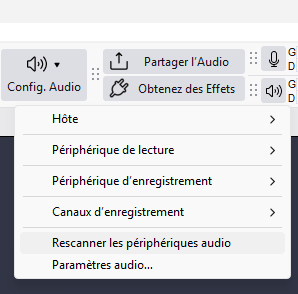 Si "Périphérique d'enregistrement" est en grisé, cliquer sur "Rescanner les périphériques audio".