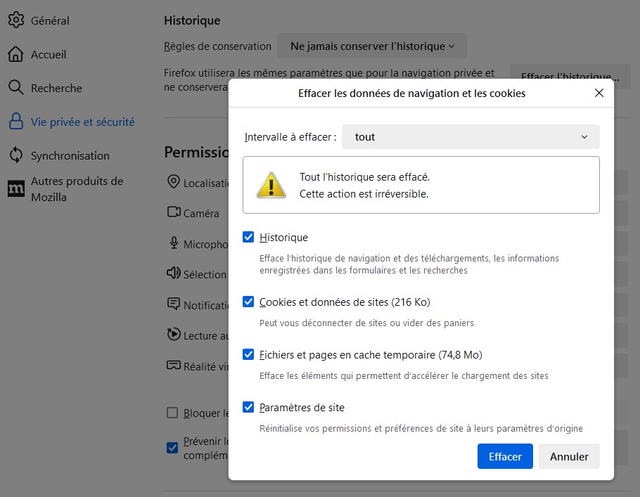 Sur Firefox, cliquer sur les 3 barres horizontales et aller dans Paramètres, Vie privée et sécurité, Historique, Effacer l'historique :
