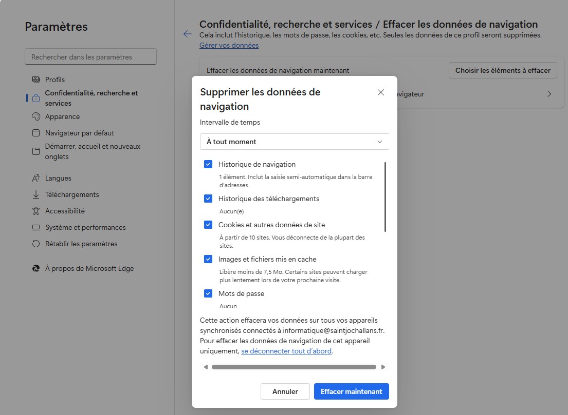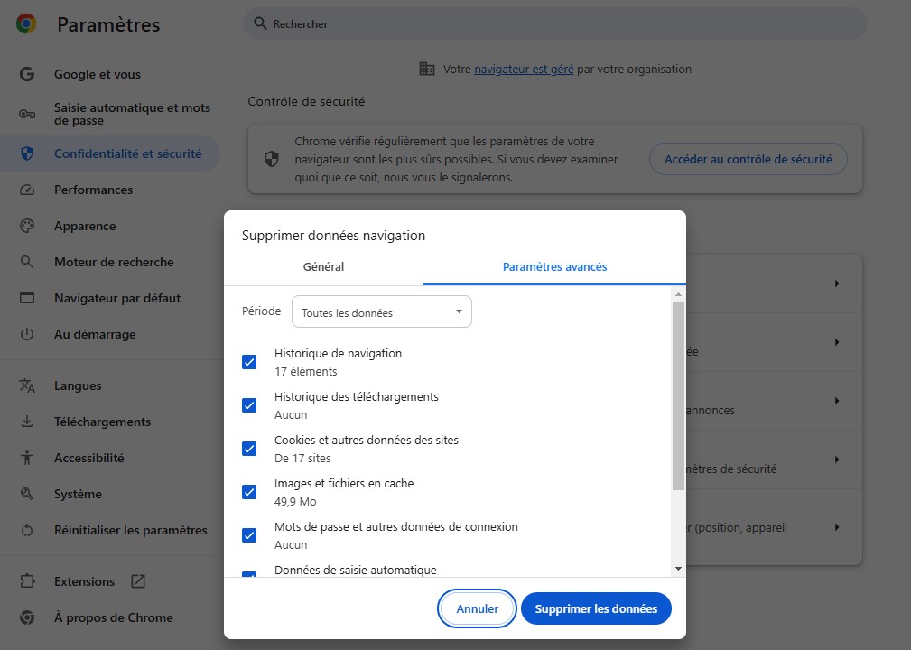 Sur Chrome, cliquer sur les 3 points verticaux et aller dans Paramètres, Confidentialité et sécurité, Supprimer données de navigation :