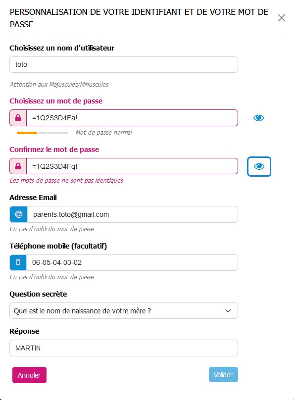 Si l'identifiant Ecole Directe est déjà utilisé, à la fin, ajoutez votre date de naissance :